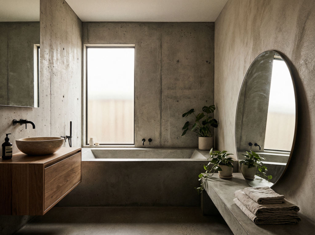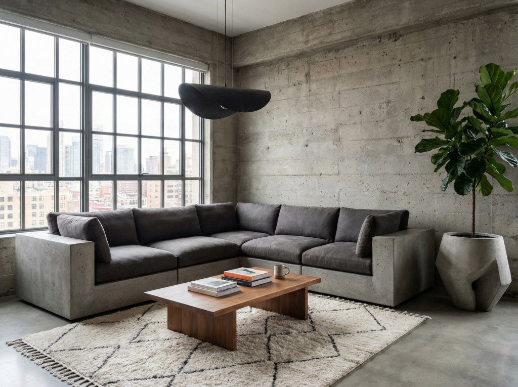 Kluczem jest kontrast. Miękkie tkaniny, ciepłe światło i naturalne drewno równoważą surowość. W małych mieszkaniach warto stosować brutalizm punktowo – np. jedna ściana z mikrocementu zamiast całego pomieszczenia.