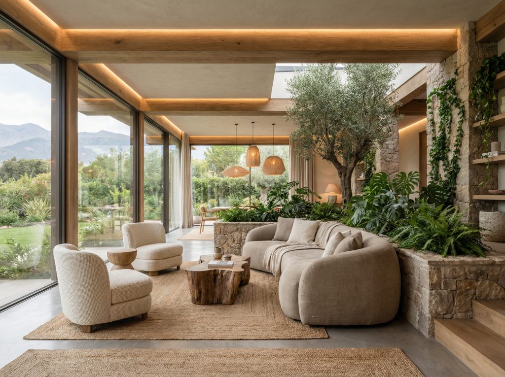 Podstawą biofilicznego wnętrza jest świadome wprowadzanie elementów natury. Najważniejszą rolę odgrywa światło dzienne. Duże przeszklenia, lekkie zasłony i otwarte układy pomieszczeń pozwalają naturalnemu światłu swobodnie przenikać do środka. Światło zmienia się w ciągu dnia, a wraz z nim zmienia się atmosfera wnętrza — dokładnie tak, jak w naturze.
