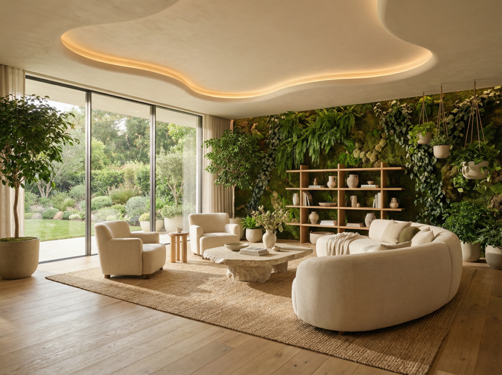 Równie ważna jest obecność roślin. Zieleń działa uspokajająco, poprawia jakość powietrza i tworzy żywy element kompozycji. W biofilicznych wnętrzach rośliny nie są dodatkiem, ale integralną częścią architektury — mogą tworzyć zielone ściany, wydzielać strefy lub stanowić naturalne akcenty w kluczowych punktach przestrzeni.