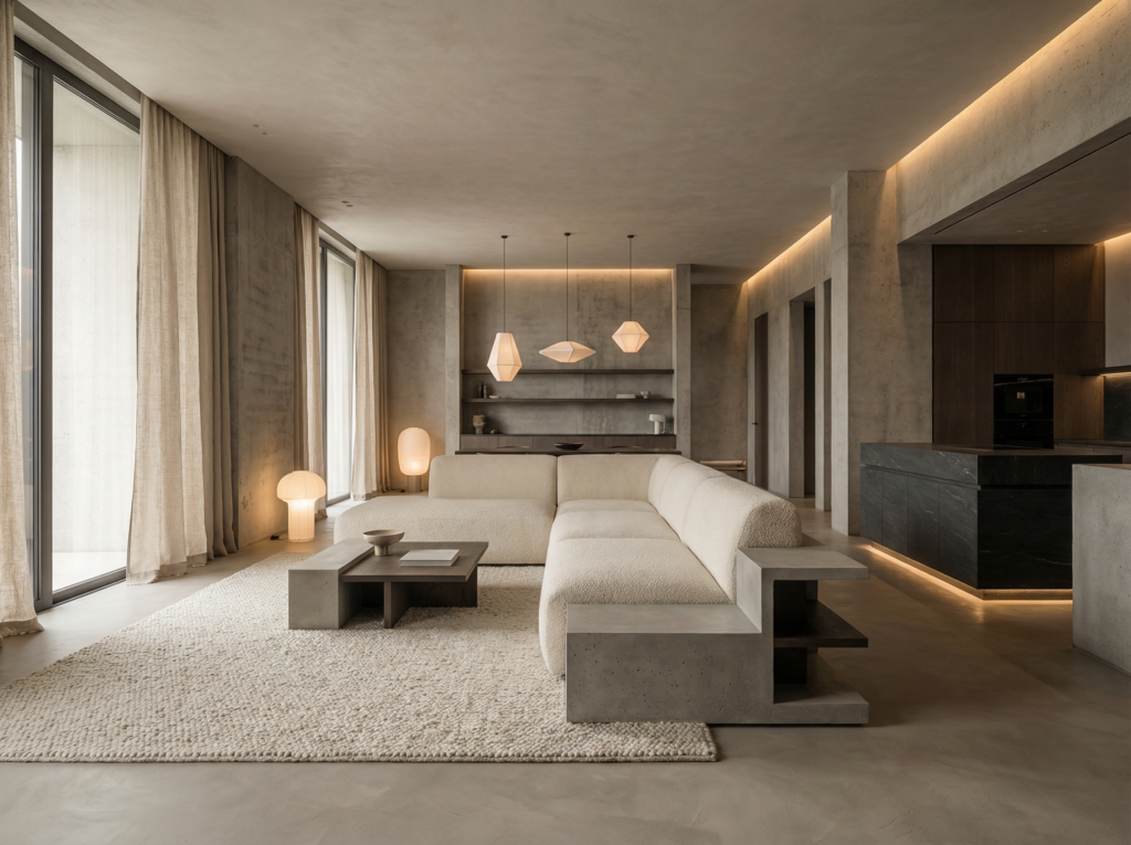 Neo-brutalistyczne wnętrze ma klimat spokojny, niemal medytacyjny. Brak nadmiaru dekoracji sprawia, że uwaga skupia się na proporcjach i fakturach. Światło odgrywa kluczową rolę — punktowe, architektoniczne oświetlenie wydobywa strukturę materiałów i rysuje miękkie cienie.