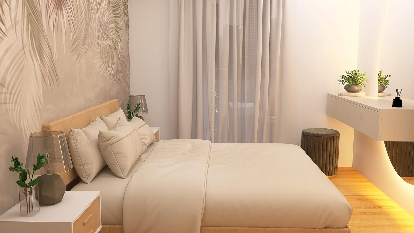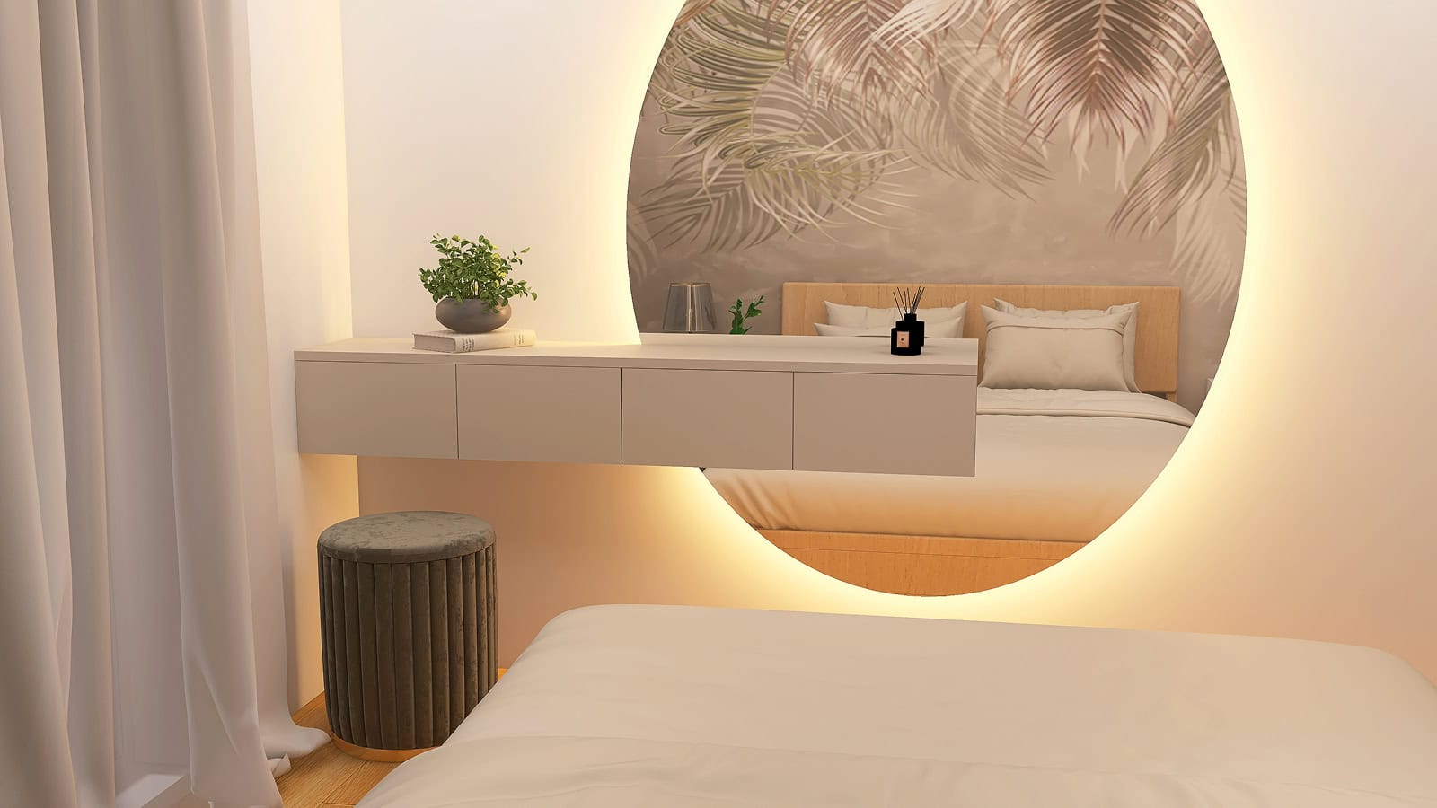 Z myślą o młodej parze w wieku 25–35 lat zaprojektowano tu wygodne łóżko z pojemnym schowkiem, który pomaga utrzymać porządek nawet w niewielkiej przestrzeni. Obok znajduje się idealnie zorganizowana szafa PAX oraz delikatna toaletka z lustrem podświetlonym LED, ustawionym tak, aby dodatkowo odbijało wzór fototapety.