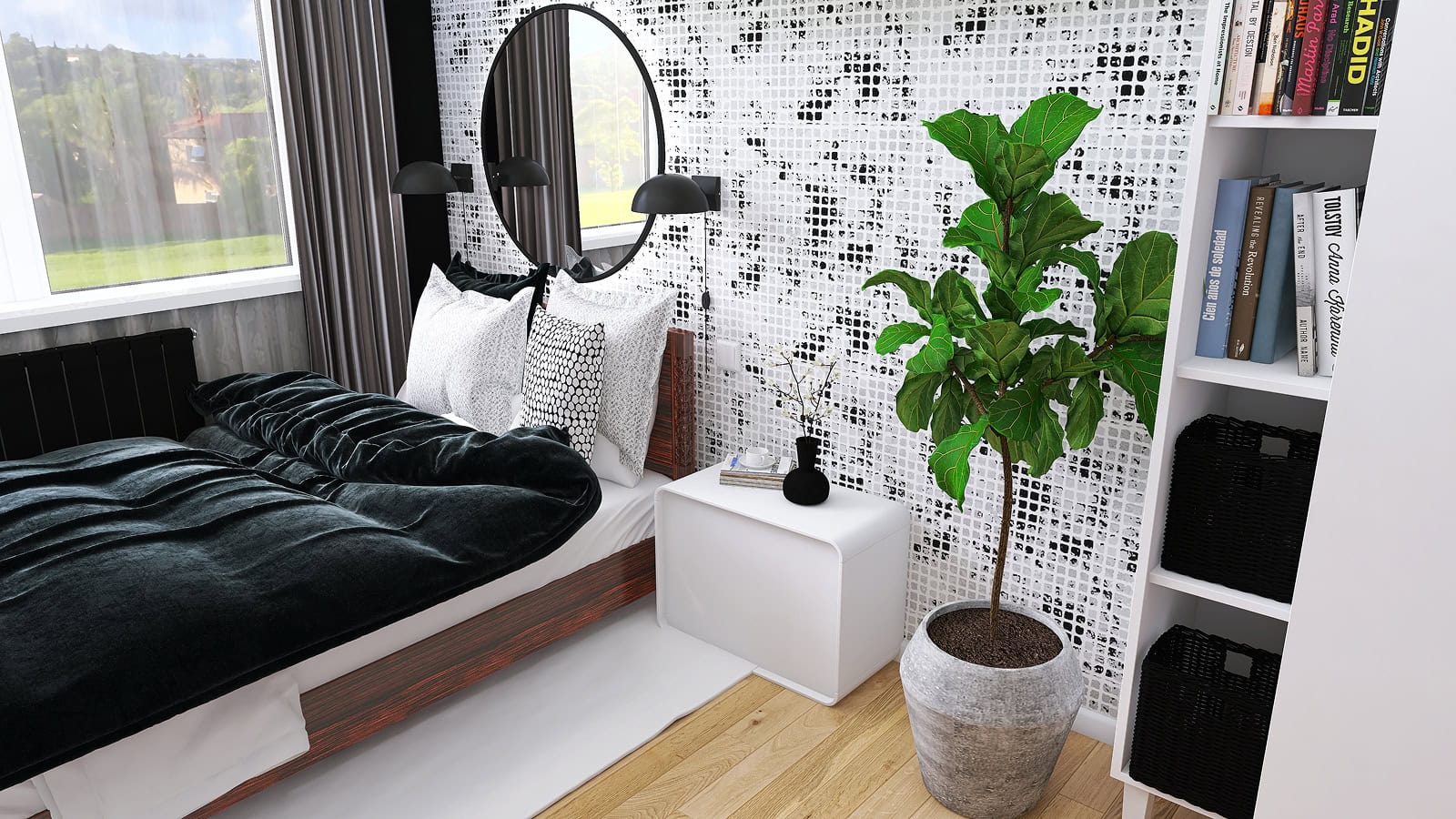 Wnętrze utrzymane jest w monochromatycznych kolorach, z dominacją bieli i czerni. To, co przykuwa uwagę to z pewnością ciekawy wzór tapety w formie mozaiki.