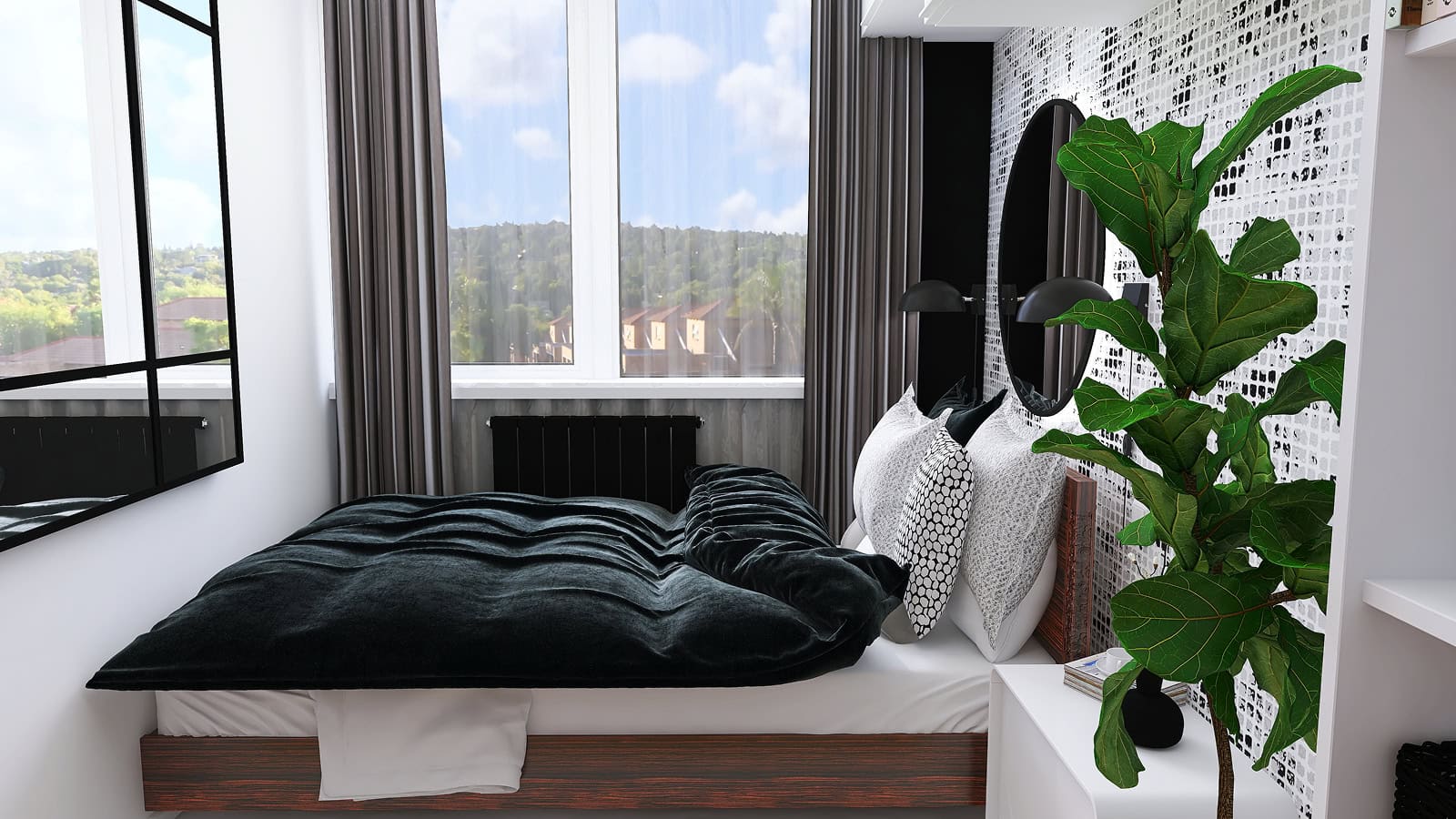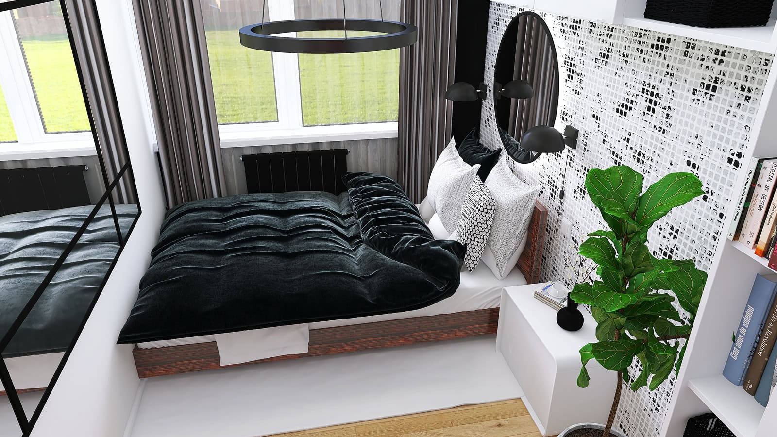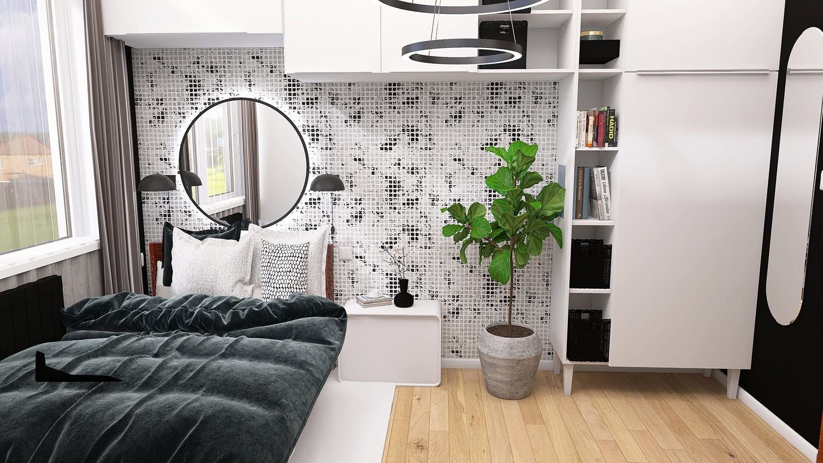 Przy projektowaniu sypialni zawsze trzeba pamiętać o funkcjonalności. W tym projekcie sypialni mamy mnóstwo miejsca do przechowywania – po prawej stronie zaproponowałam zabudowę składającą się zarówno z szafy, szafek, jak i otwartych półek – aby Inwestor mógł uporządkować swoje ubrania i dodatki. Oprócz tego, po jednej stronie łóżka mamy miejsce na stolik nocny, gdzie można odłożyć okulary, książkę, telefon czy szklankę wody – wszystko, co chcemy mieć pod ręką podczas odpoczynku. Dodatkowo, w sypialni znajdują się również duże lustra, które powiększają i rozświetlają wnętrze.